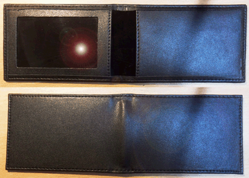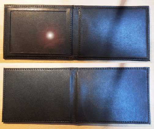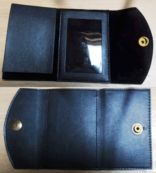 Add cutout and holder to your wallet: - Cutout allows the badge to fit better in the wallet and helps it to stay fixed in place. Our cutouts are made to fit our badges' shape but they may work with other badges too. Due to the anatomy of the above wallets, cutouts are available only for "type 3" and "type 4" wallets. - Badge holder is a rectangular piece of cardboard covered with black syntetic material. It bears holes in different sizes and positions, depending from which type of cutout you selected (this is because badges have attachment pins in different sizes and positions). Badge holder allows you to firmly attach your badge and put it inside the wallet, without having to pin or glue the badge to wallet's fabric. Cutout is a couple of millimeters smaller than actual badge's size, in order to avoid seeing cutout shape. Please keep in mind that those cutouts are not "recessed": badge will not fit deep into them. This is because badge pocket is not thick enough to create a recessed cutout. In these items, cutout only allows badge to be firmly attached to the wallet itself and provide a better appearance: ![]() Comparison between badges pinned directly to wallet (top) and badges attached to holder in a cutout wallet (bottom). Price: 15,00 €
